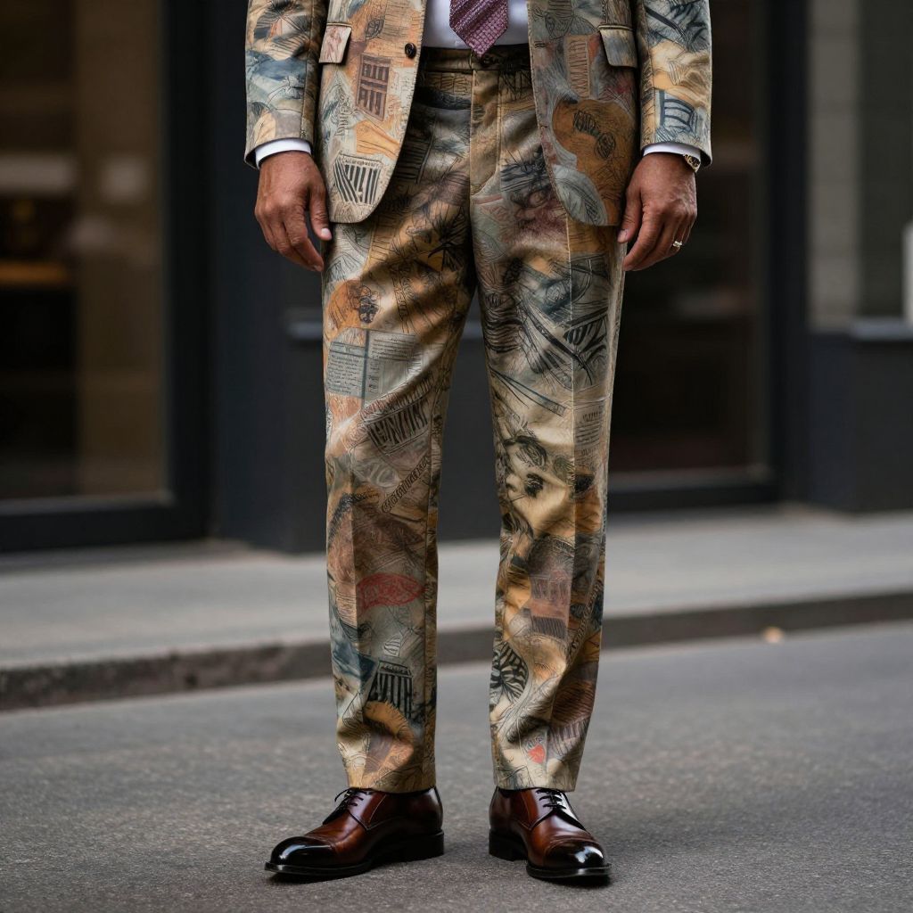 Street fashion for men in a vibrant city street, featuring bold colors and unique patterns, realistic photography style