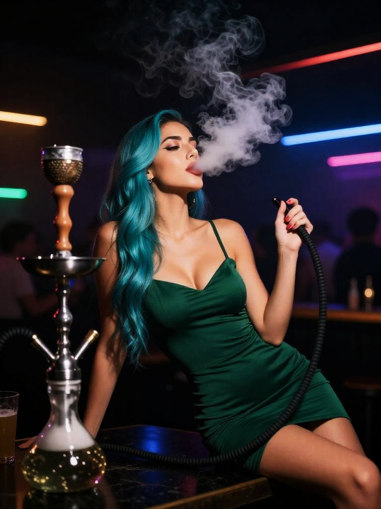 Woman smoking shisha, glamorous nightlife scene, slender woman with long turquoise hair and porcelain skin lounging at a bar counter, holding a long shisha hose with fragrant smoke swirling around her face, wearing emerald green bodycon dress with deep neckline, neon-lit club interior with colorful bokeh lights and crowded dance floor in the background, cinematic moody lighting, sharp focus, highly detailed, atmospheric nightlife photography