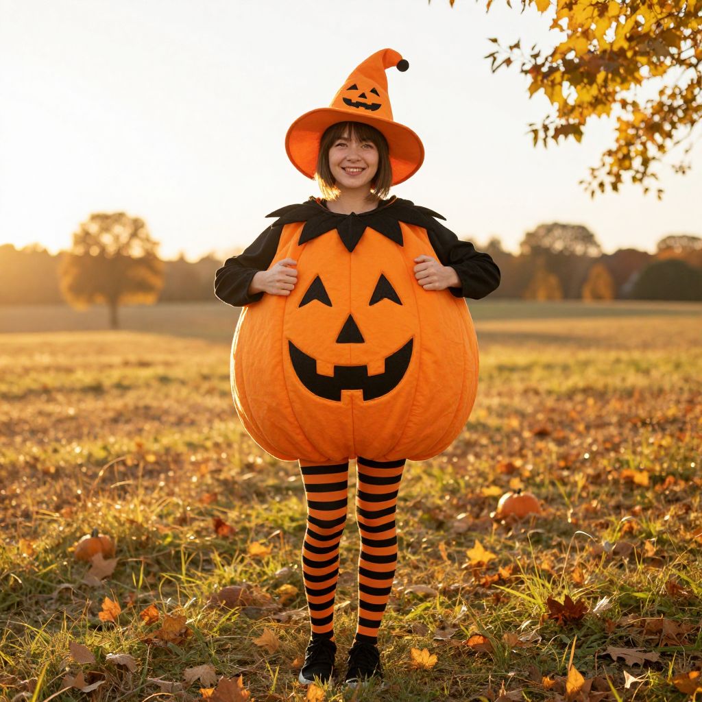 A person in a vibrant pumpkin costume is standing on a sunny, grassy field during autumn. The person wears an orange and black costume featuring a detailed pumpkin face with orange details and black accents, an orange wide-brimmed hat with a carved pumpkin design, and stylish striped black and orange leggings. The background shows a golden-hued autumn landscape with falling leaves, a few trees in the distance, and a soft, warm sunset lighting the scene. The person is smiling confidently, with a friendly expression, and the atmosphere feels joyful and festive, capturing the spirit of Halloween.