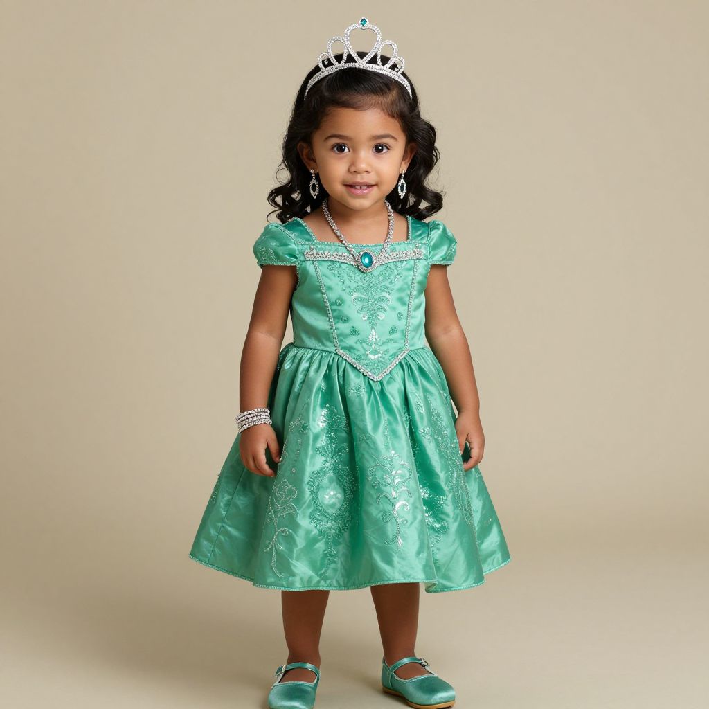 Photograph of a young South Asian girl with dark curly hair, wearing a turquoise princess dress, white tiara, and matching shoes, against a plain