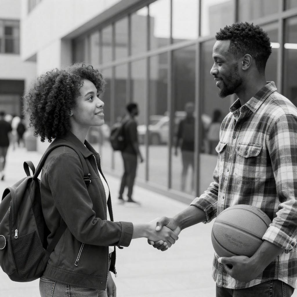 Black-and-white photograph of two African-American individuals in a brightly lit urban setting. The woman with curly hair, wearing a dark jacket and backpack, shakes hands with a man in a plaid shirt and holding a basketball. Both look at each other, standing in front of a glass wall with blurred people in the background.