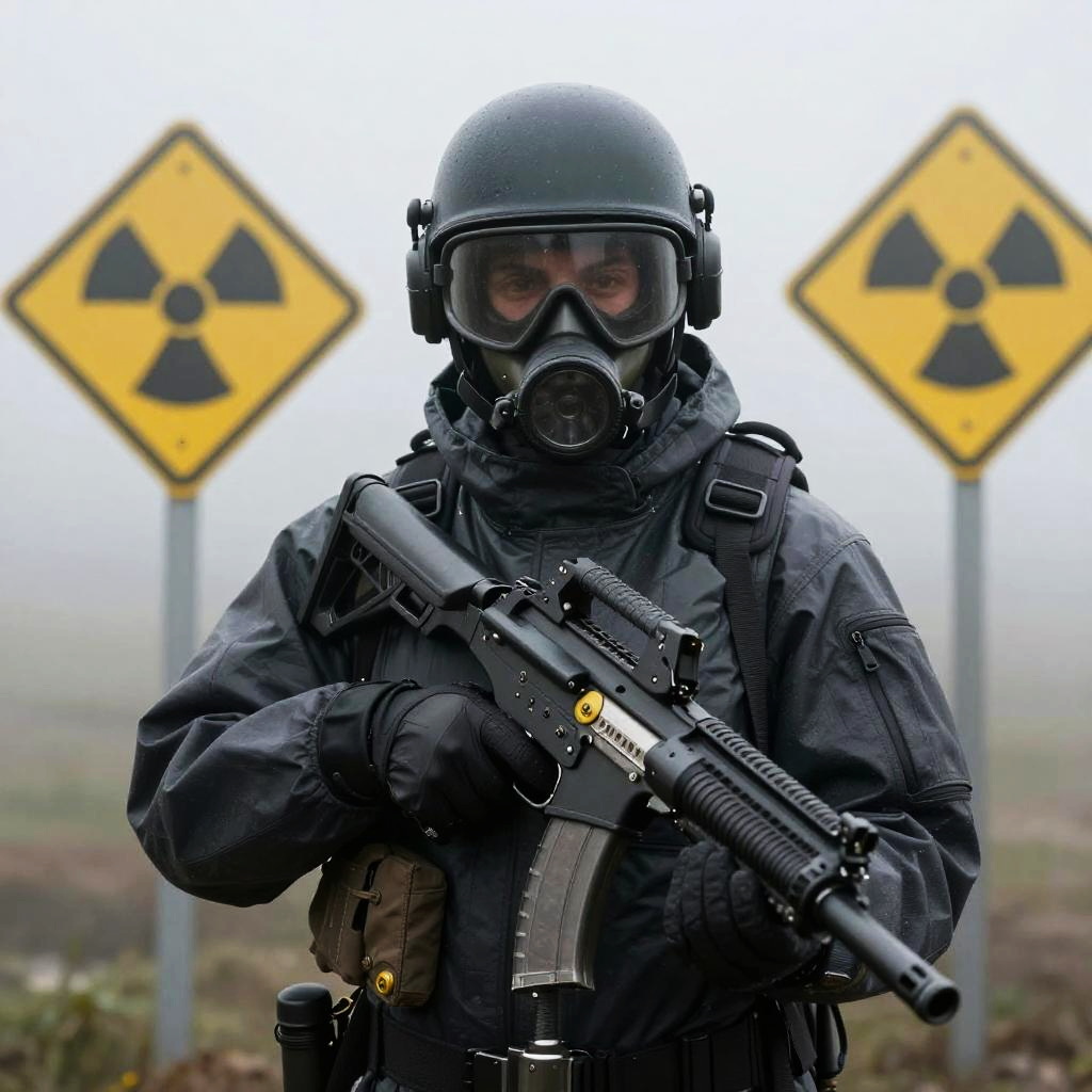 Dystopian uniform featuring tactical gear and gas mask, rebel fighter standing in a ruined industrial district, dystopian world with red sky and ruined infrastructure