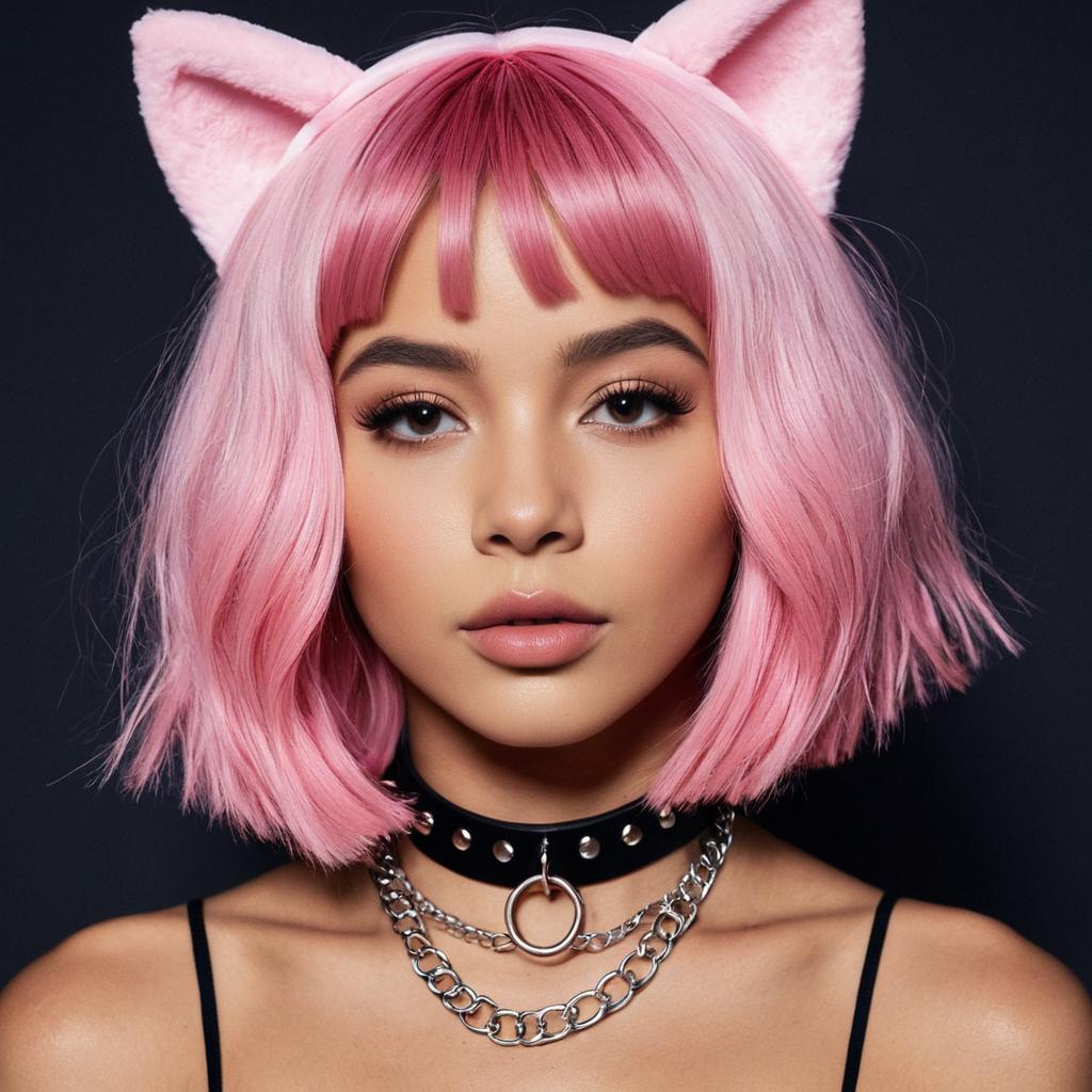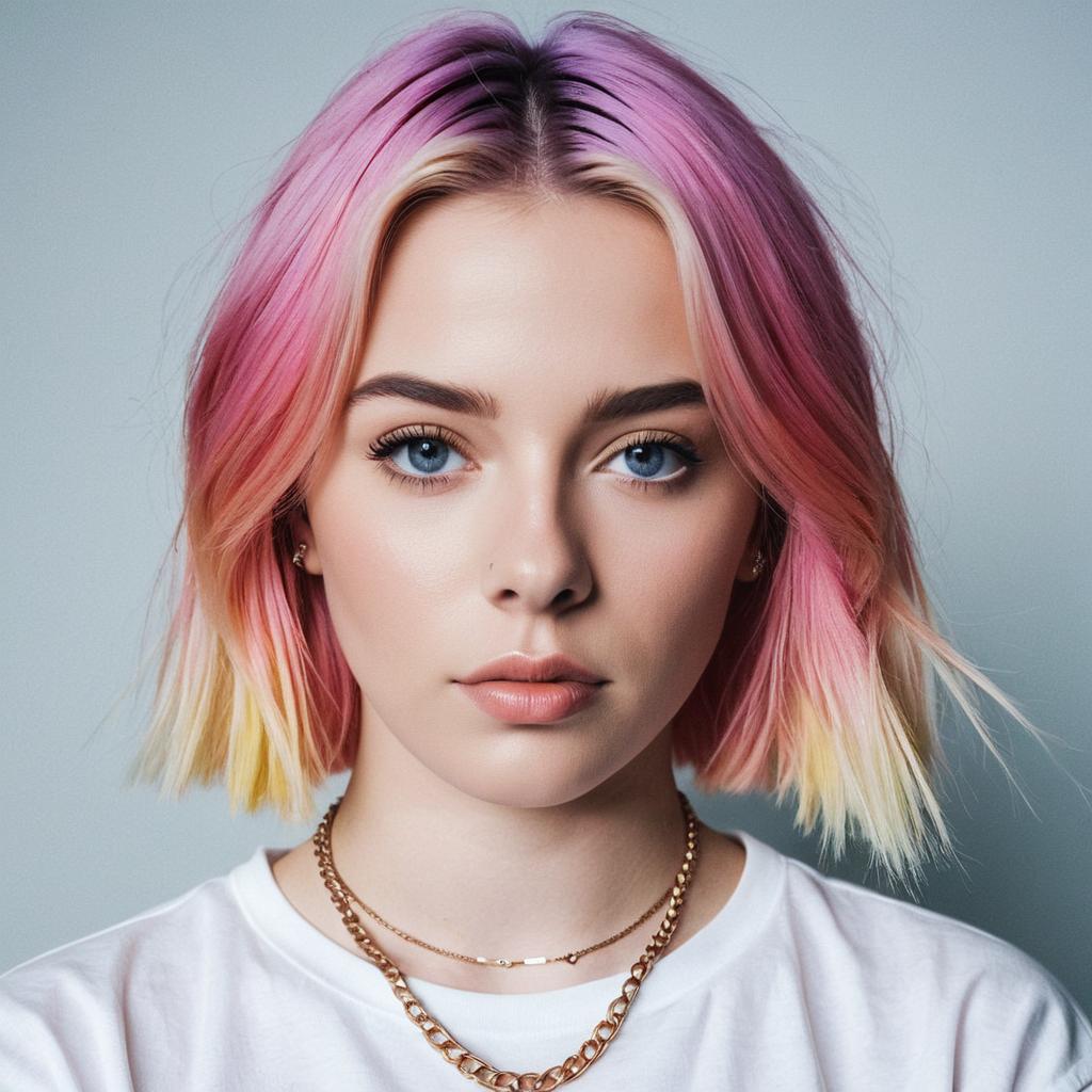 Ombre wig short hair,solo, 1girl, jewelry, multicolored hair, necklace, pink hair, long hair, realistic, looking at viewer, black hair, shirt, upper body, two-tone hair, lips, wavy hair, white shirt
