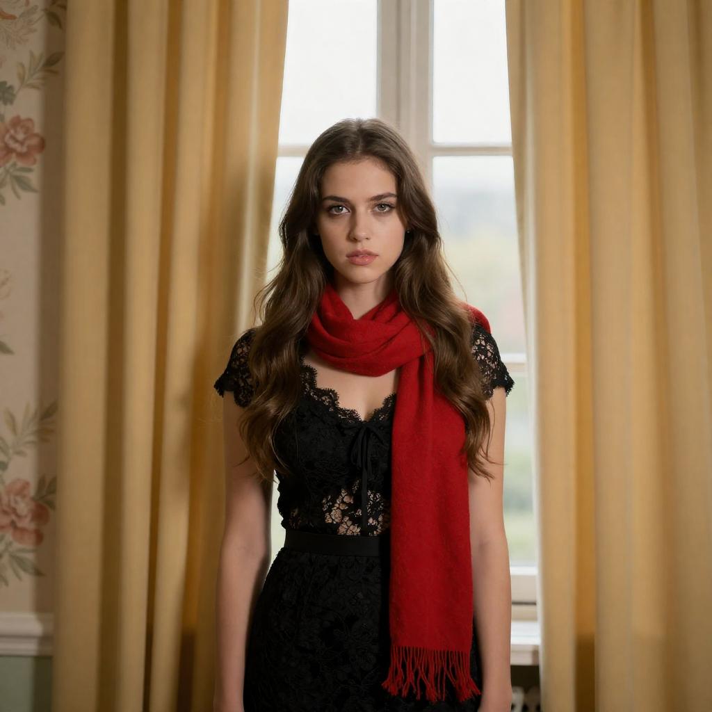 Photograph of a woman with wavy brown hair, wearing a black fur coat, holding her collar. She has red lipstick, intense gaze, and dramatic lighting. Background has vertical wooden panels and a dark red wall. She is in a three-quarter profile, looking slightly to the right.