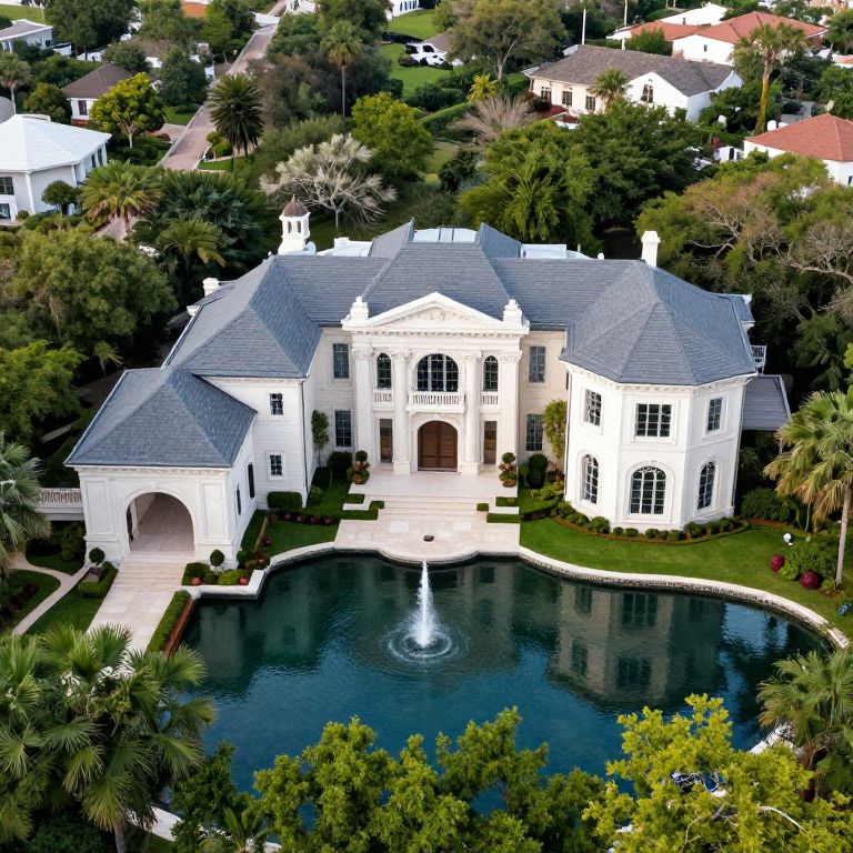 Aerial photograph of a grand, white, two-story mansion with a gray, steeply-pitched roof, set amidst lush greenery. The mansion features tall, arched windows and a central, prominent entrance with a triangular pediment. In the foreground, a circular, blue-tinted pool with a central water fountain adds elegance. The mansion is surrounded by manicured lawns, palm trees, and other residential houses in the background. The image is brightly lit, highlighting the mansion's pristine exterior and the surrounding greenery.