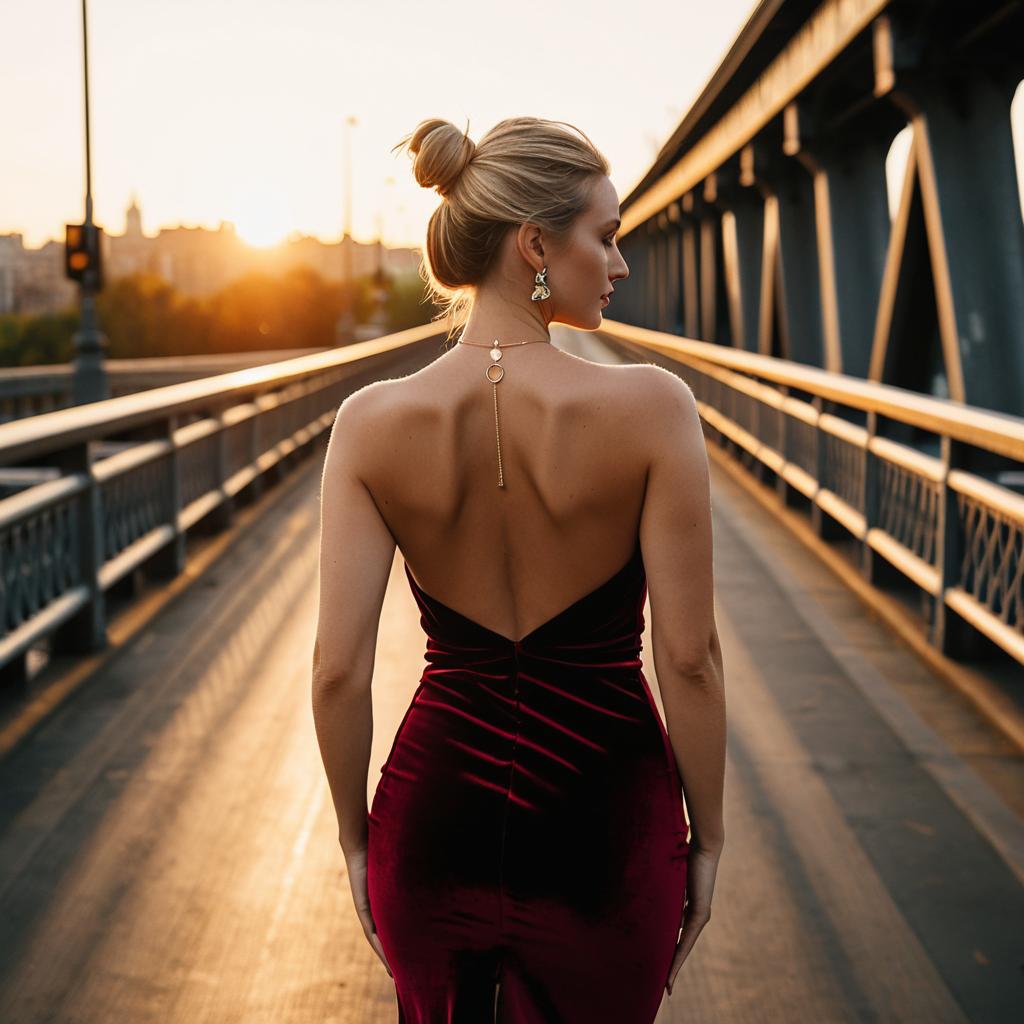 Fashion portrait of slender woman with sun-kissed blonde hair in a loose low bun in a backless fitted dress, massive tits, standing on an urban bridge at golden hour, body turned away from the camera while looking back over her shoulder, soft warm sunset light, shallow depth of field, cinematic mood, dress in rich burgundy velvet, subtle jewelry, glossy editorial photography