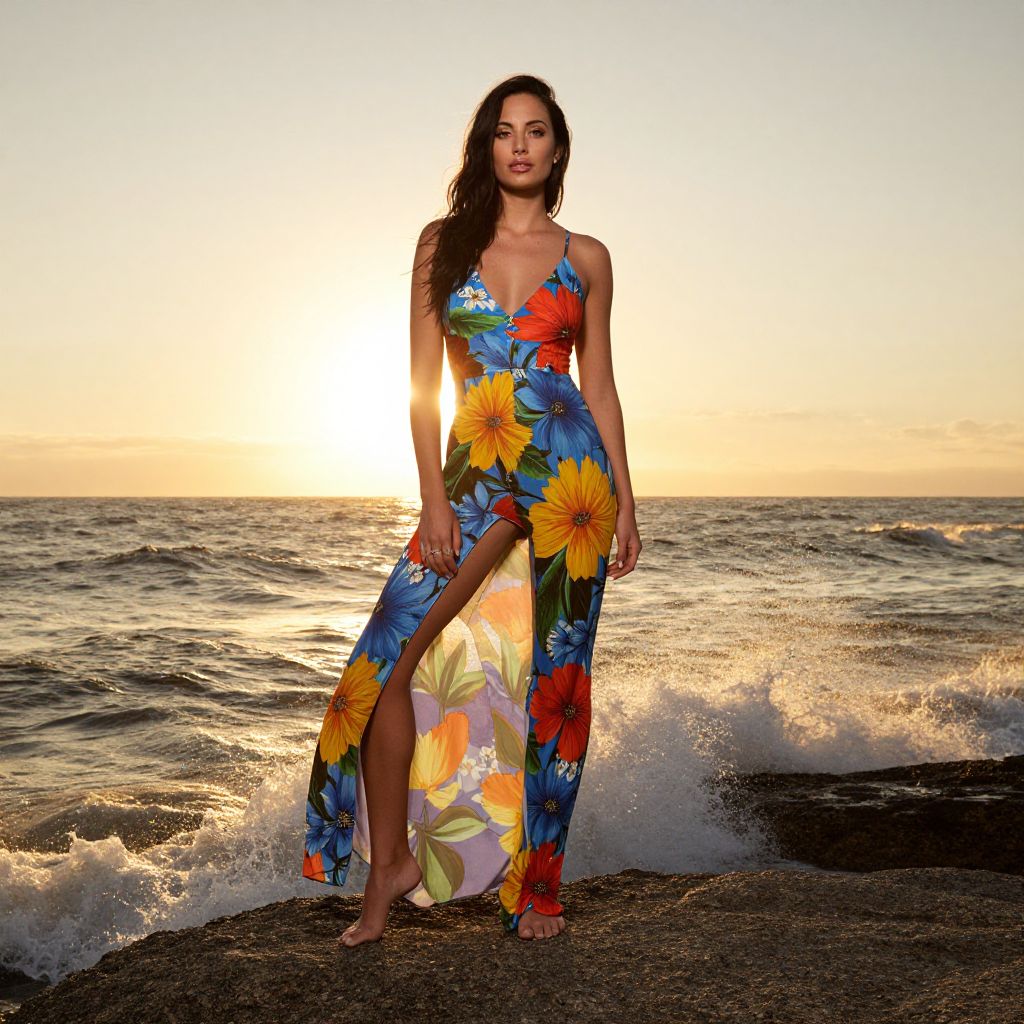 Photograph of a woman with long dark hair, wearing a colorful floral sundress with a high slit, standing on a rocky beach at sunset with sun