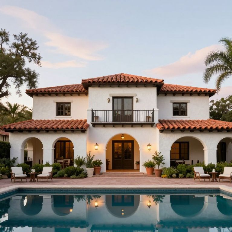 Spanish-style hacienda in Austin's Spanish Oaks neighborhood showcases a two-story structure with terracotta roof tiles, arched doorways, and a central balcony, surrounded by manicured landscaping, outdoor seating, and a tranquil pool reflecting the serene sky above.