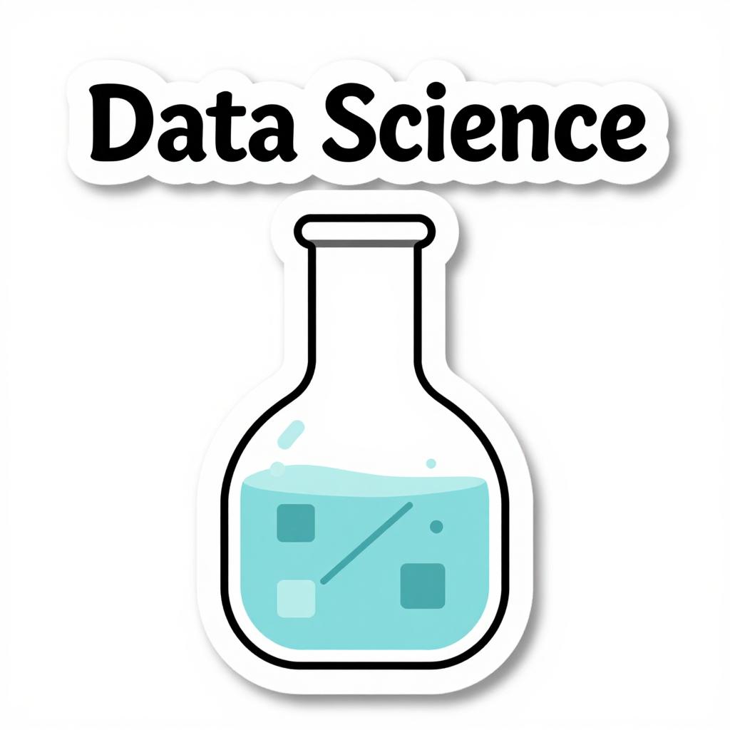 Retro-Inspired a sticker representing the concept of data science, there is a laboratory beaker with a narrow mouth and white base inside, theres liquid, on the liquid there is an image of a scatter plot. Cartoon style. Textless,