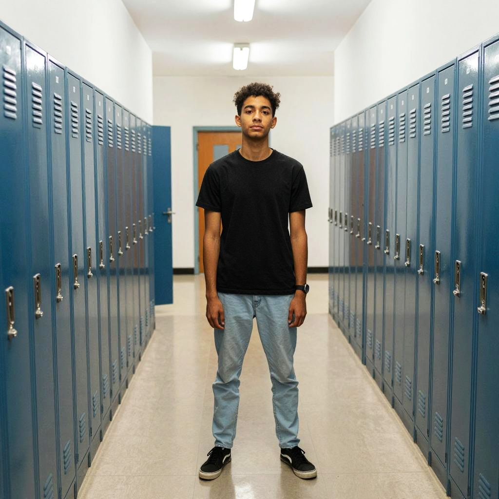 A young man stands confidently in a high school hallway, with rows of lockers lining the walls on both sides.