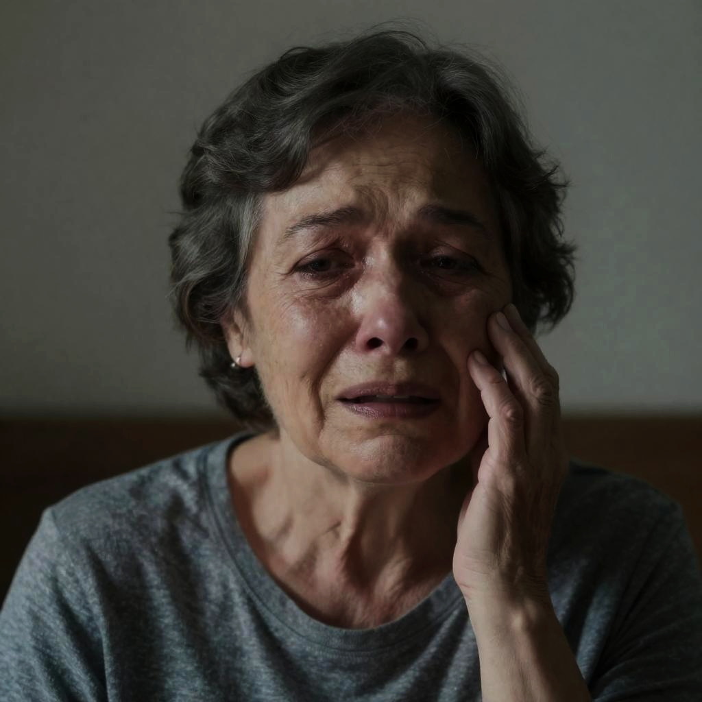 Realistic photo.Portrait of an elderly woman weeping expressing deep sorrow, rendered with dramatic light and a graphic style. The composition captures an intense moment of heartbreak, trending on ArtStation with hyperrealistic details. realistic photo