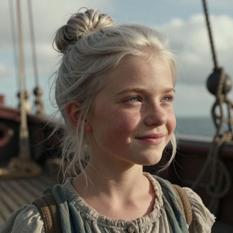 Craft a hyper-realistic portrait of a weathered yet smiling girl with resilient skin and soft blue eyes, her silver hair in a disheveled bun framing her face. From a low angle, capture her thoughtful gaze as she looks off into the distance from an old wooden ship's deck. Soft sunlight filters through clouds above, casting warm shadows across her features and the worn ropes, evoking nostalgia for distant lands. Every wrinkle and crease is highlighted with impeccable clarity and depth.
