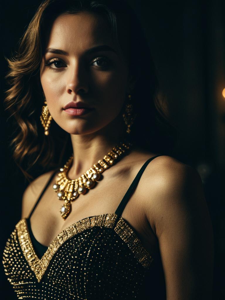 Woman in Mini Ball Gown, close-up glamorous headshot with jewelry --sref 1391