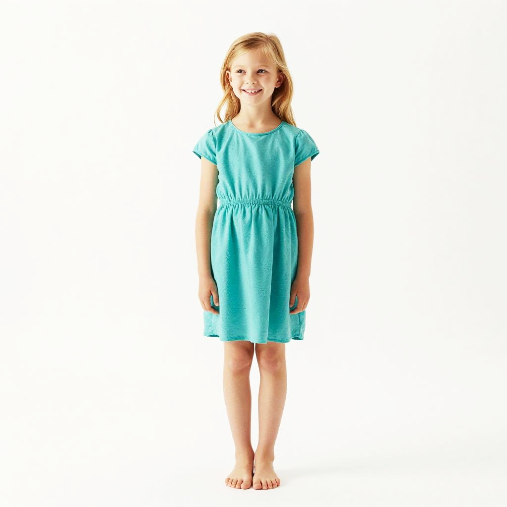 A photograph of a smiling young girl with light blonde hair, standing barefoot against a plain white background. She's wearing a teal, short-sleeved, knee-length dress with a gathered waist. Her arms are relaxed at her sides, and she's looking slightly to the right. The image has a bright, even lighting, making her the clear focus.