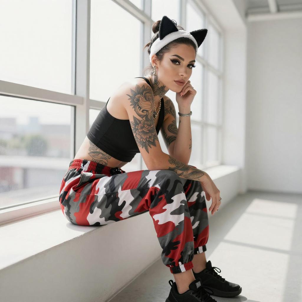 Photograph of a tattooed woman with long black hair, wearing a white t-shirt, plaid pants, and black sneakers, squatting in front of a silver car. She has cat ear headbands and a gold wristwatch, with a blurred urban background.