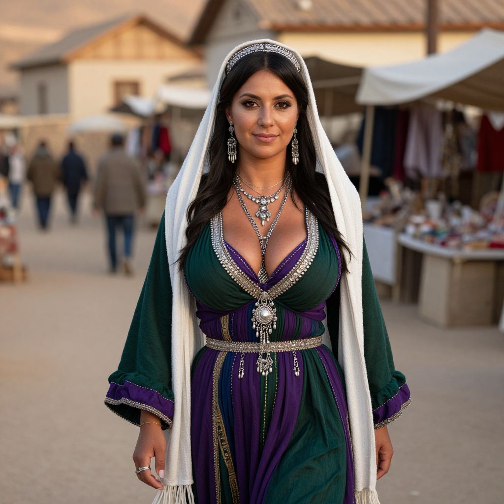 Photograph of a woman in a vivid gypsy costume—deep green and purple layered fabrics, silver beaded accessories, and a wide white shawl—walking through a dusty market in a Balkan village, her face has sun-kissed tan skin, deep brown eyes, and a serene smile, golden hour lighting, authentic environment. The woman has big tits and cute face