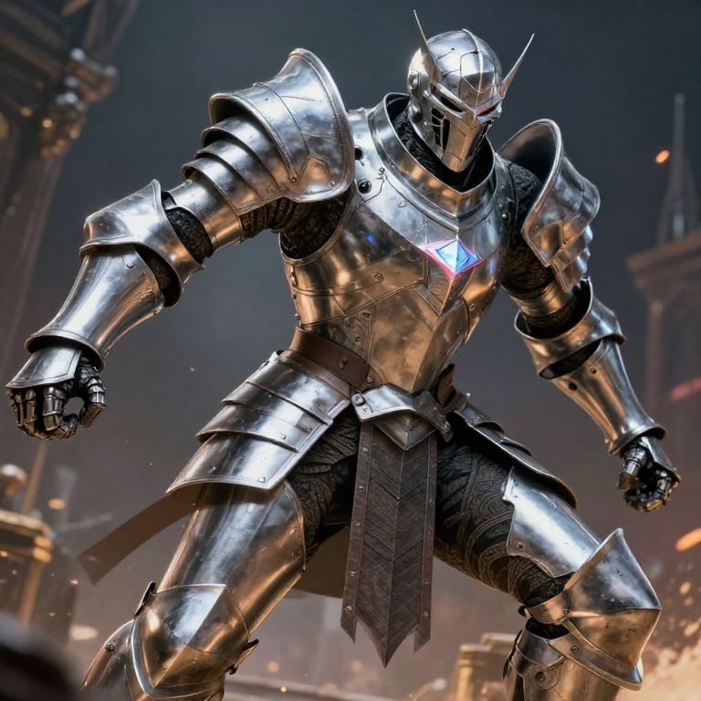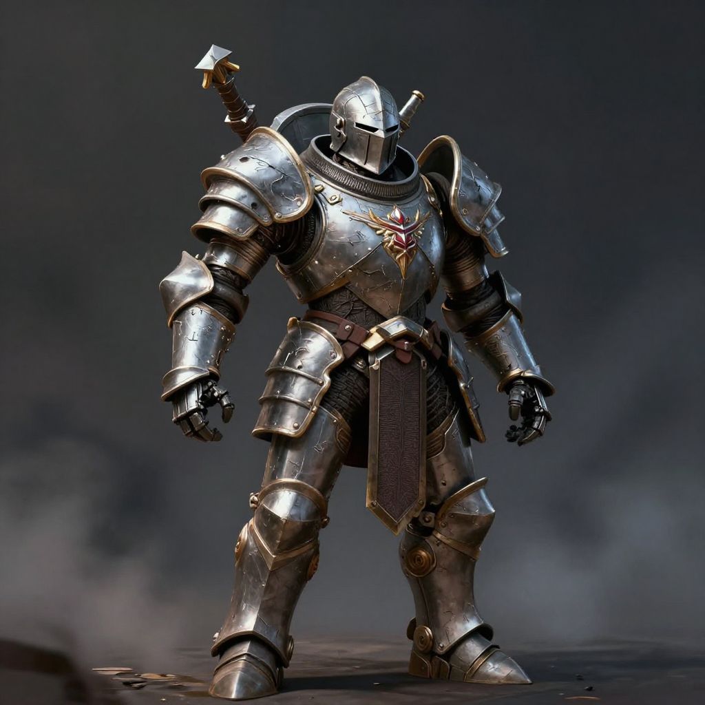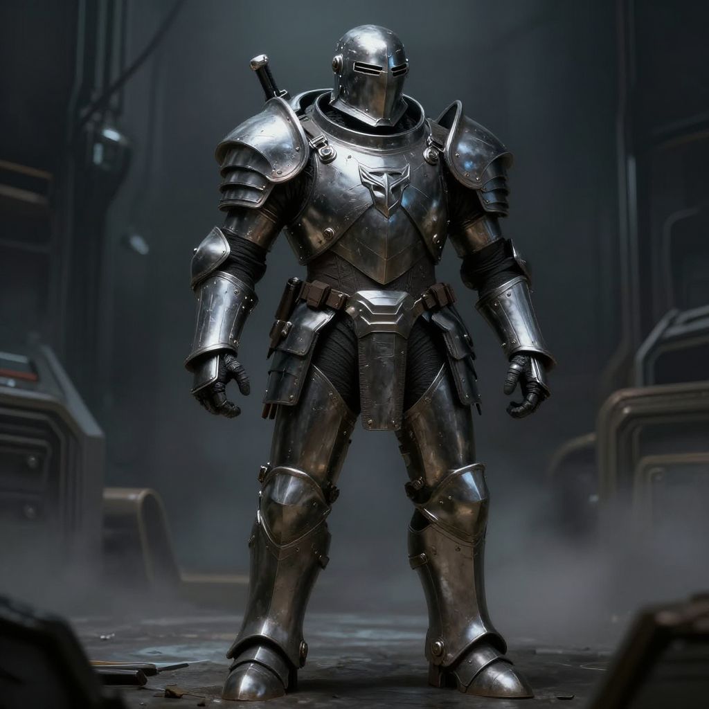 Sardaukar armor set in dimly lit futuristic armory, metallic reflections and scratches, advanced tactical design, menacing stance, atmospheric fog, highly detailed digital painting