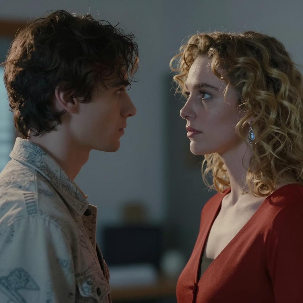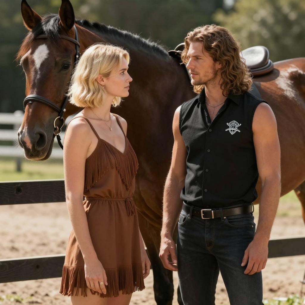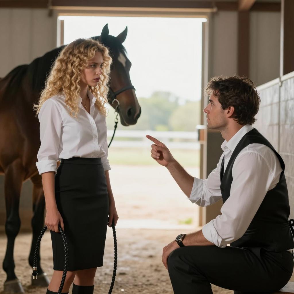 Two people in a barn. A woman with curly blonde hair, wearing a white shirt and black skirt, holds a whip with a serious expression. A man with dark hair, wearing a white shirt and black vest, kneels. A horse is in the background. The woman's hand is extended towards the man. Bright light from an open door. Concrete pillars.