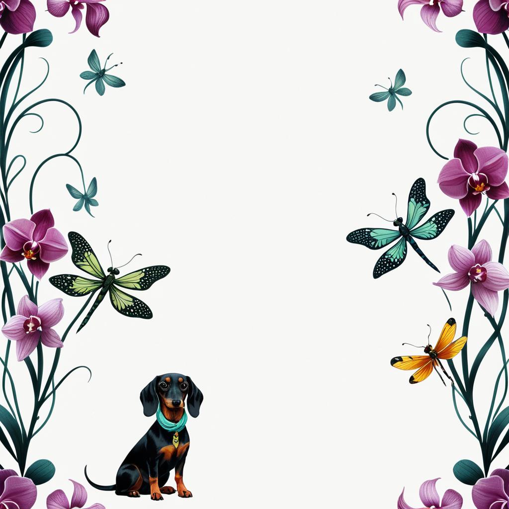 Elegant scarf border pattern featuring orchids, dragonflies, and a lively dachshund intertwined in a cute Pixar-inspired style, by Eyvind Earle, isolated on a white background, sprite sheet format