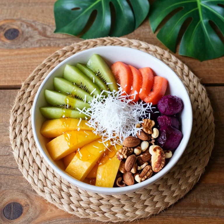 Photograph of a white bowl filled with colorful fruit slices, nuts, and coconut flakes, on a woven placemat, with green monstera leaves