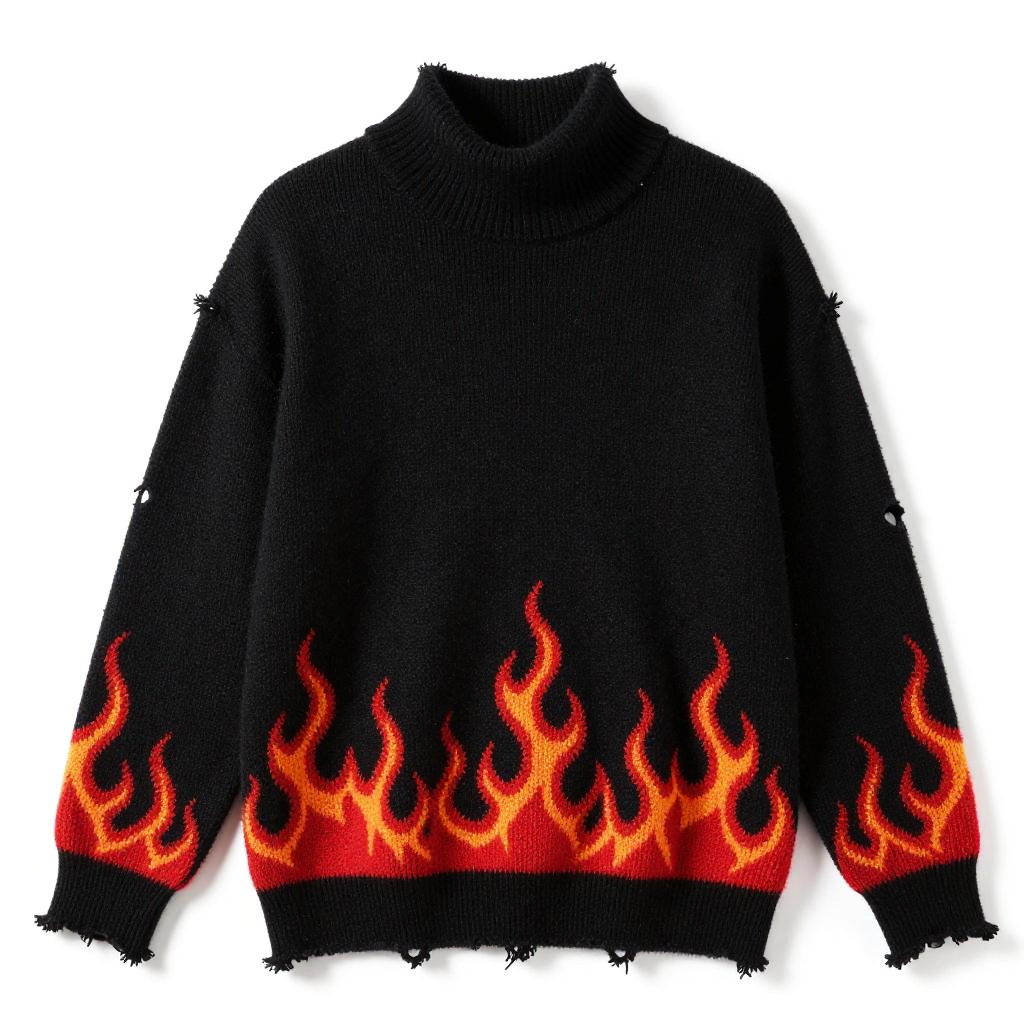 A photo of a black, long-sleeve, oversized sweater with a high neck and tattered edges. The bottom hem features bright red, flame-like patterns that spread upwards slightly. The sweater has small, irregular holes on the sleeves and body, adding a rugged, punk-inspired look. The background is plain white, making the dark and fiery colors stand out prominently.