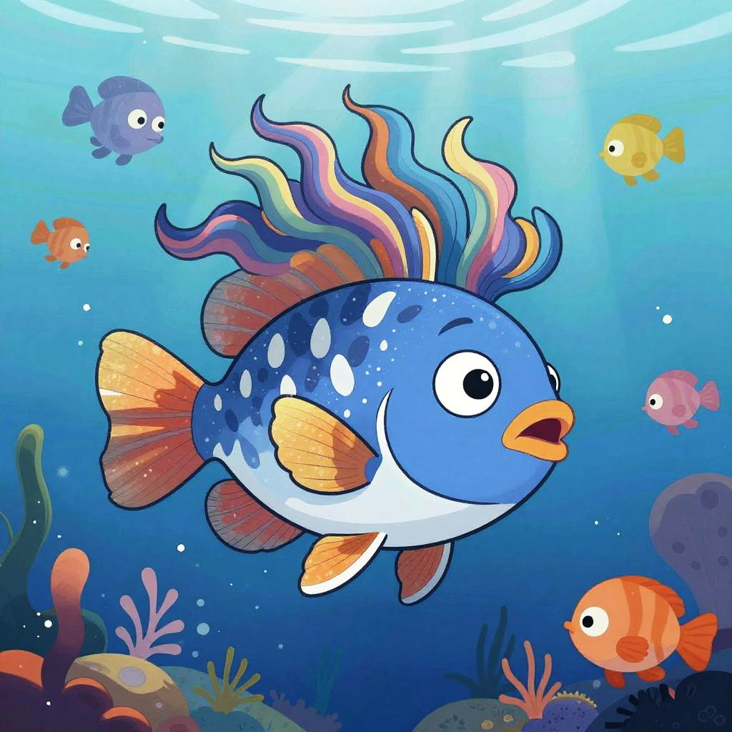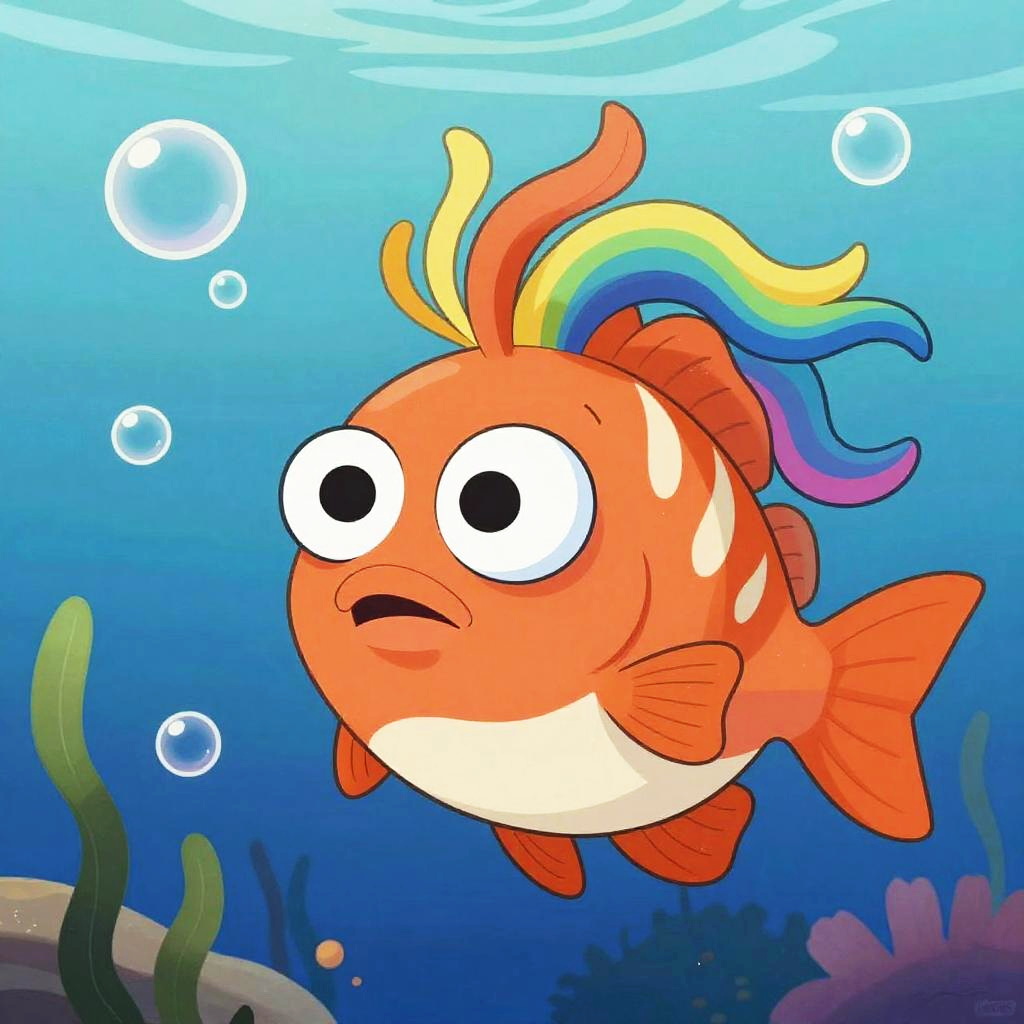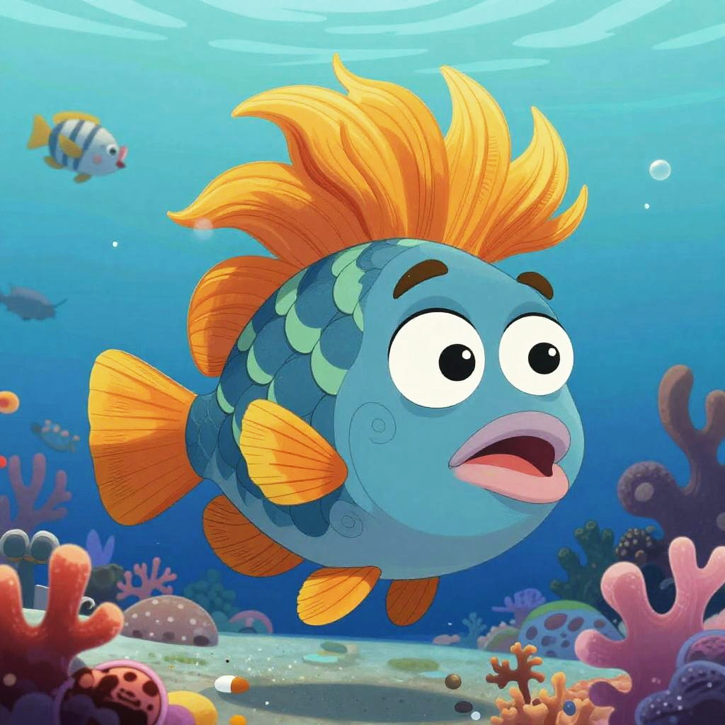 Fish with hair cartoon style, vibrant colors, whimsical underwater scene, exaggerated features, playful expression, detailed scales and flowing hair, bright coral reef background