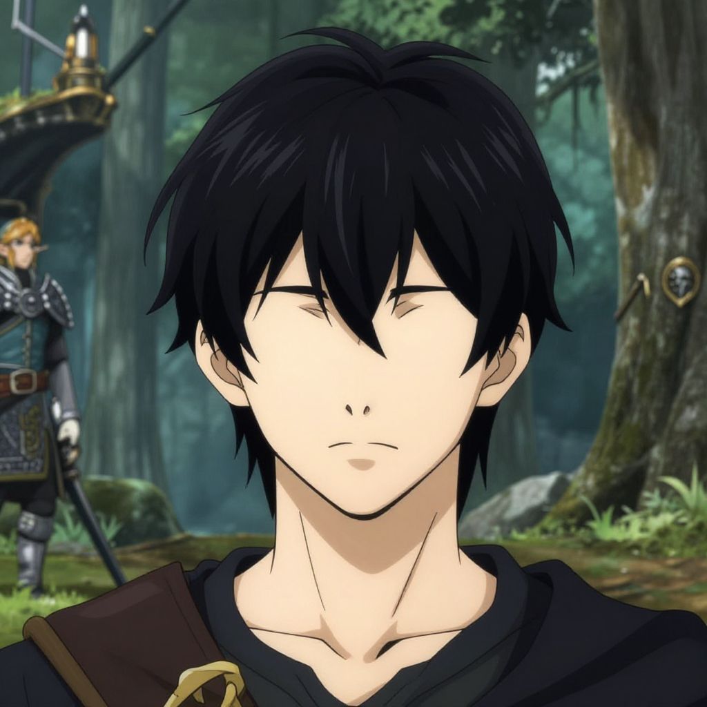 "Sweetheart generic anime boy Handsome young adult man portrait head and body, short black hair covering face, medieval fantasy, game of thrones, legend of zelda, skyrim, lord of the rings,"