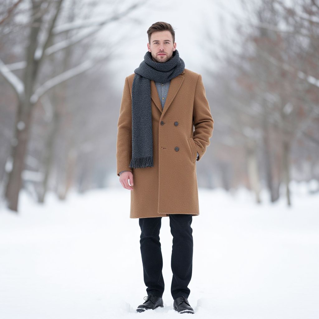 "Winter Wedding Looks Man, man in a coat and scarf standing in the snow"