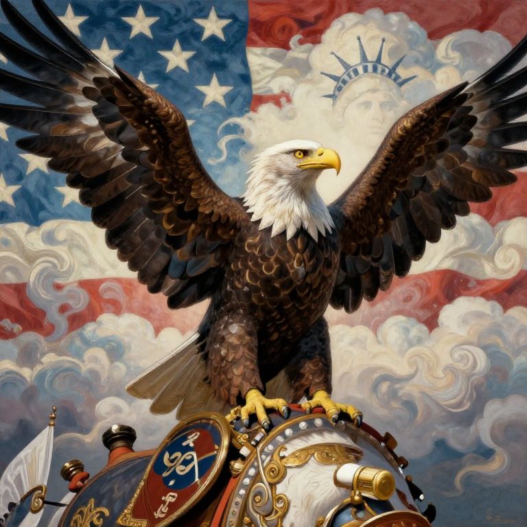 Digital artwork of a majestic bald eagle with wings spread, perched on an ornate drum, against a colorful American flag background.