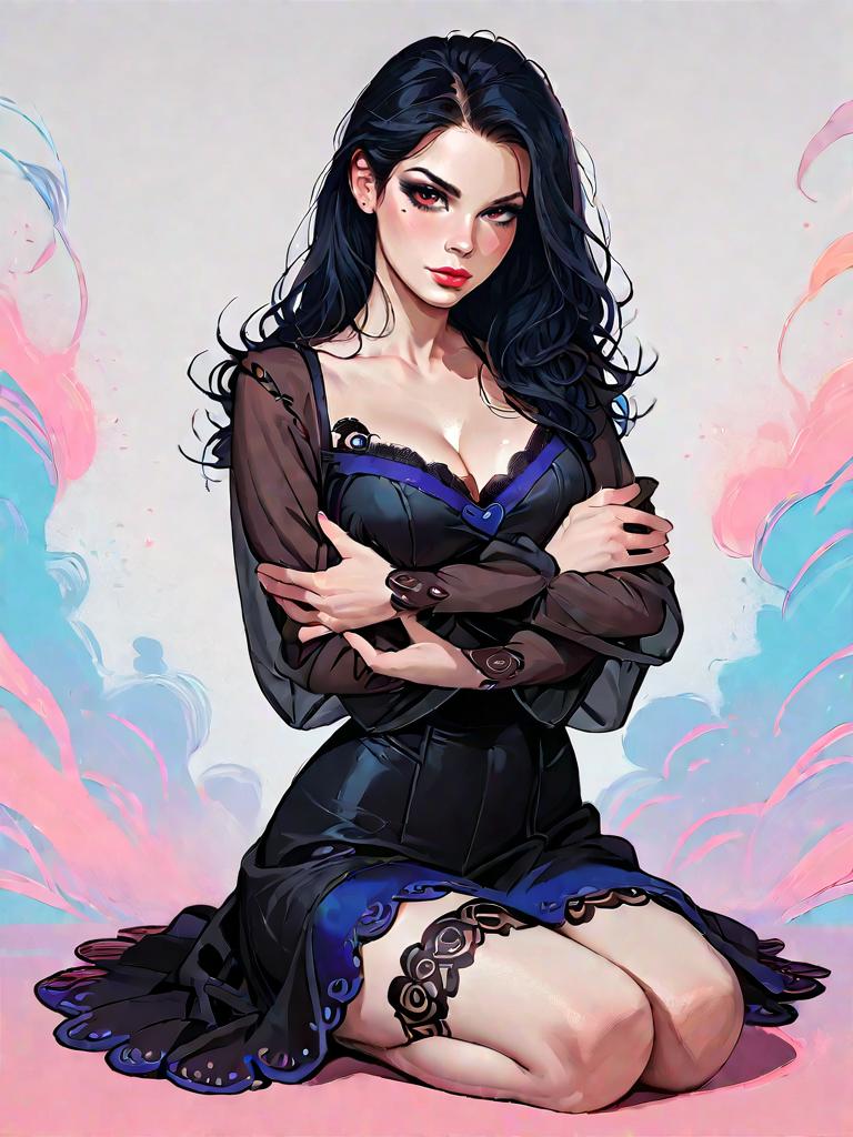 A digital portrait of a brunette woman with side-parted straight hair, wearing a faded vintage blue denim corset crop top with a lace-up front and frayed neckline. She poses indoors in a softly lit room with neutral walls and potted plants, resting one hand lightly on her shoulder and gazing directly at the viewer. The woman has large breasts and a colorful floral tattoo on her upper arm, accented with delicate earrings and subtle makeup, highlighting an intimate modern fashion style.
