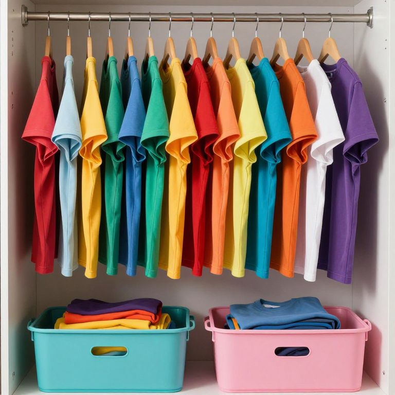 Neatly arranged rainbow-colored T-shirts hang in perfect order on wooden hangers within a closet, accompanied by two storage bins—one teal and one pink—below, each containing folded garments.