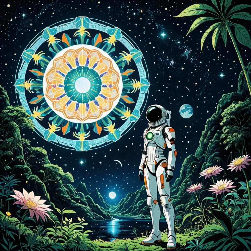 Illustration of an interstellar botanist wearing a luminous floral-patterned ethereal fabric suit standing beside a giant flower-shaped bioship. The scene is set on a bioluminescent jungle moon under a starfield sky, featuring vibrant flora, distant planets, and a mandala-like celestial formation, in a retro-futuristic anime style inspired by Leiji Matsumoto.