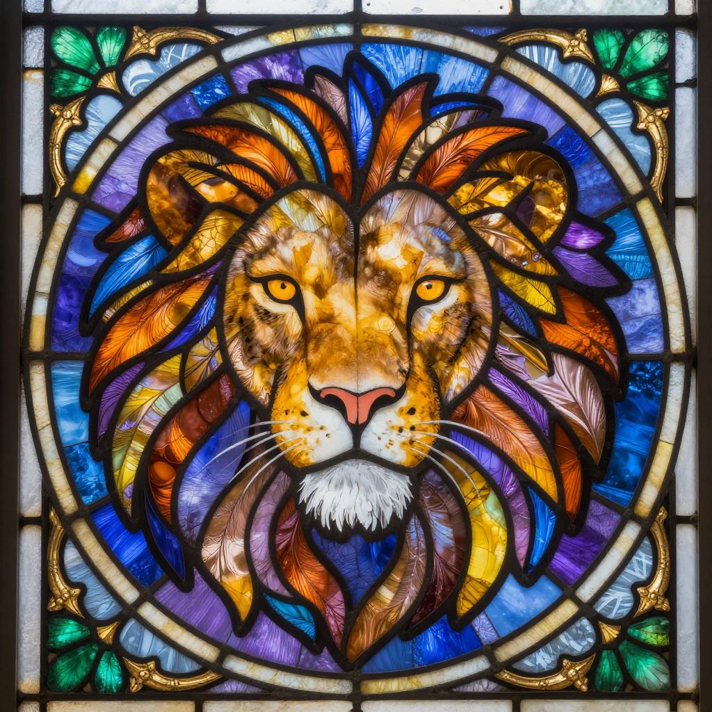 A vibrant and detailed stained glass artwork featuring a lion's head surrounded by intricate floral patterns. The lion is depicted with bold, multi-colored segments in shades of blue, purple, orange, and yellow, framed by decorative gold and green ornamental shapes.