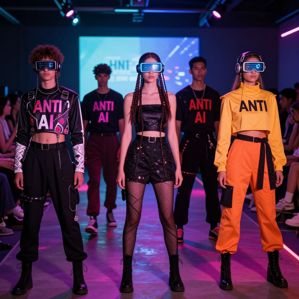Photograph of four models on a neon-lit runway wearing futuristic headsets, "ANTI AI" shirts, and diverse outfits: black, yellow,
