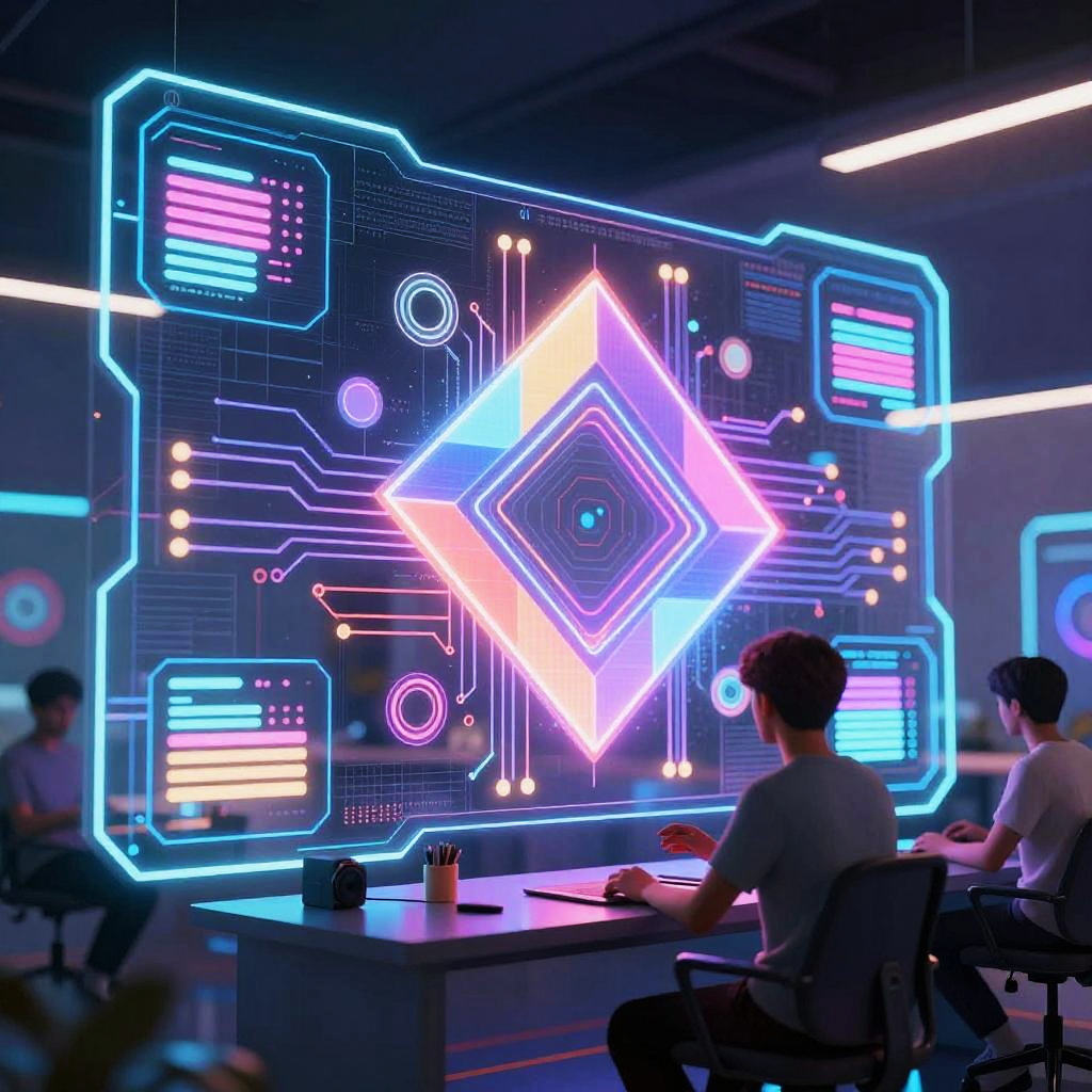 AI art prompts depicted as a futuristic glowing interface, vibrant neon colors, abstract geometric shapes blending with circuit patterns, digital artists exploring, immersive creative energy, high-tech studio environment, sleek and modern design, cinematic lighting.