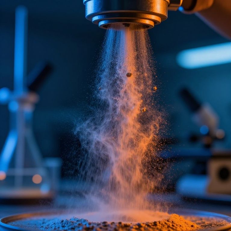 An atomized metallic powder dispersing into the air, creating a cloud of shimmering dust, illuminated by a strong blue and orange light source, ultra-detailed texture, science lab environment, cinematic composition