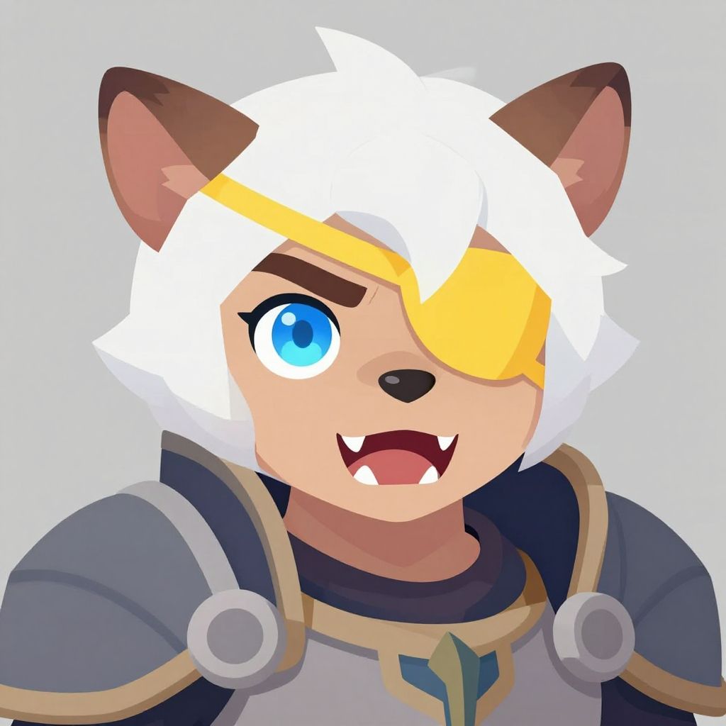Masterpiece, best quality, flat design art, 2D, flat color, flat Illustration, simple background, Rengar, felid, anthro, 1boy, armor, solo, glowing, male focus, blue eyes, heterochromia, furry, face focus, eyepatch, blue eye, yellow eyepatch, furry male, close-up, sharp teeth, realistic, colored eyepatch, looking at viewer, white hair, open mouth, facial hair, glowing eye