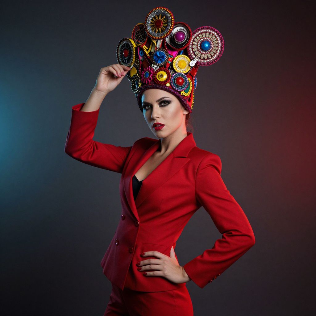 A woman in a striking red outfit with a large, ornate hat, featuring intricate details and vibrant colors, stands in a dramatic pose against a moody, cinematic background.