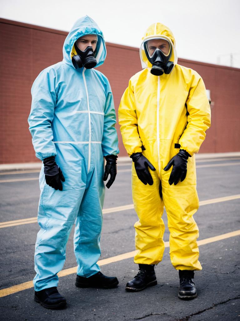 Couple in Walter White and Jesse Pinkman Costumes, full-body cosplay photo with hazmat suits