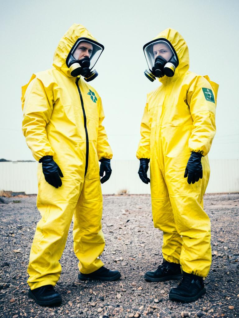 Full-body photo of two individuals wearing yellow hazmat suits and black gas masks standing outdoors on a rocky ground. Both are wearing black gloves and black footwear, with the suits featuring green patches on the arms. The background shows a pale sky and a low white barrier.