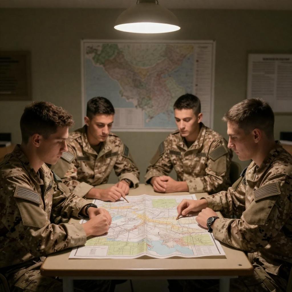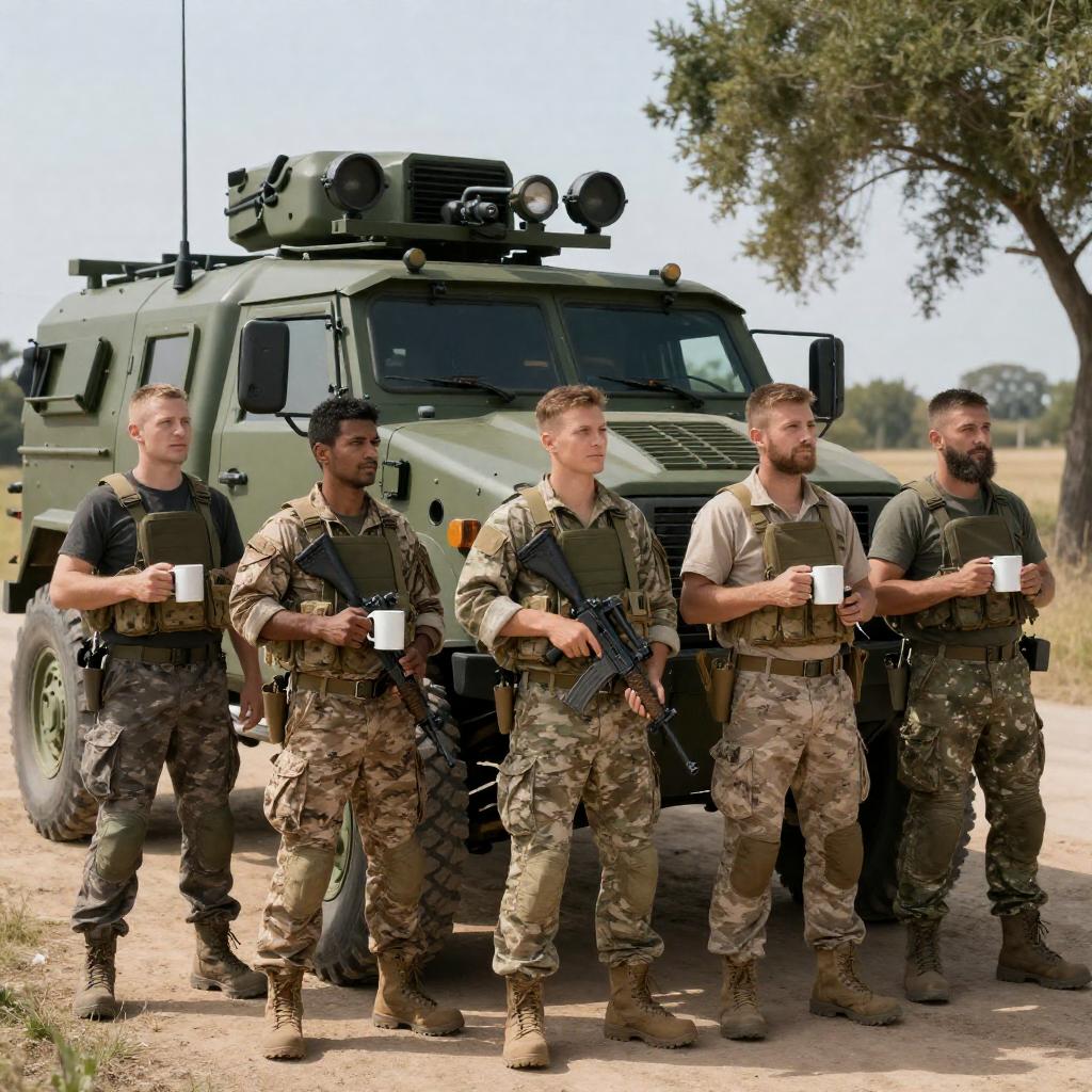 Photograph of five men standing beside a heavily modified military vehicle in a sunlit rural setting. Men have varied hair styles and facial hair, wearing camouflage and military gear. Vehicle has mounted lights, antennas, and equipment. One man holds a rifle, others hold mugs and tools. Tree and open field in background. Men's expressions are neutral. Vehicle has large tires and rugged design. Group stands in a loose line, facing right.