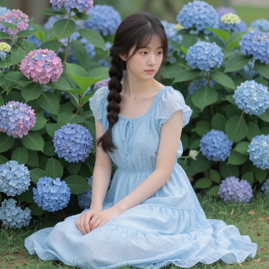 Photograph of an East Asian woman with fair skin and straight, dark brown hair sitting on grass amidst a lush bed of blooming blue hydrangeas. She wears a light blue, short-sleeved, vintage-style dress with a square neckline and subtle pleats. Her expression is gentle and slightly shy, with natural makeup highlighting her delicate features. The background is filled with vibrant blue hydrangeas and green leaves, creating a serene and picturesque garden setting. The sunlight softly illuminates her and the flowers, enhancing the calm and peaceful atmosphere.