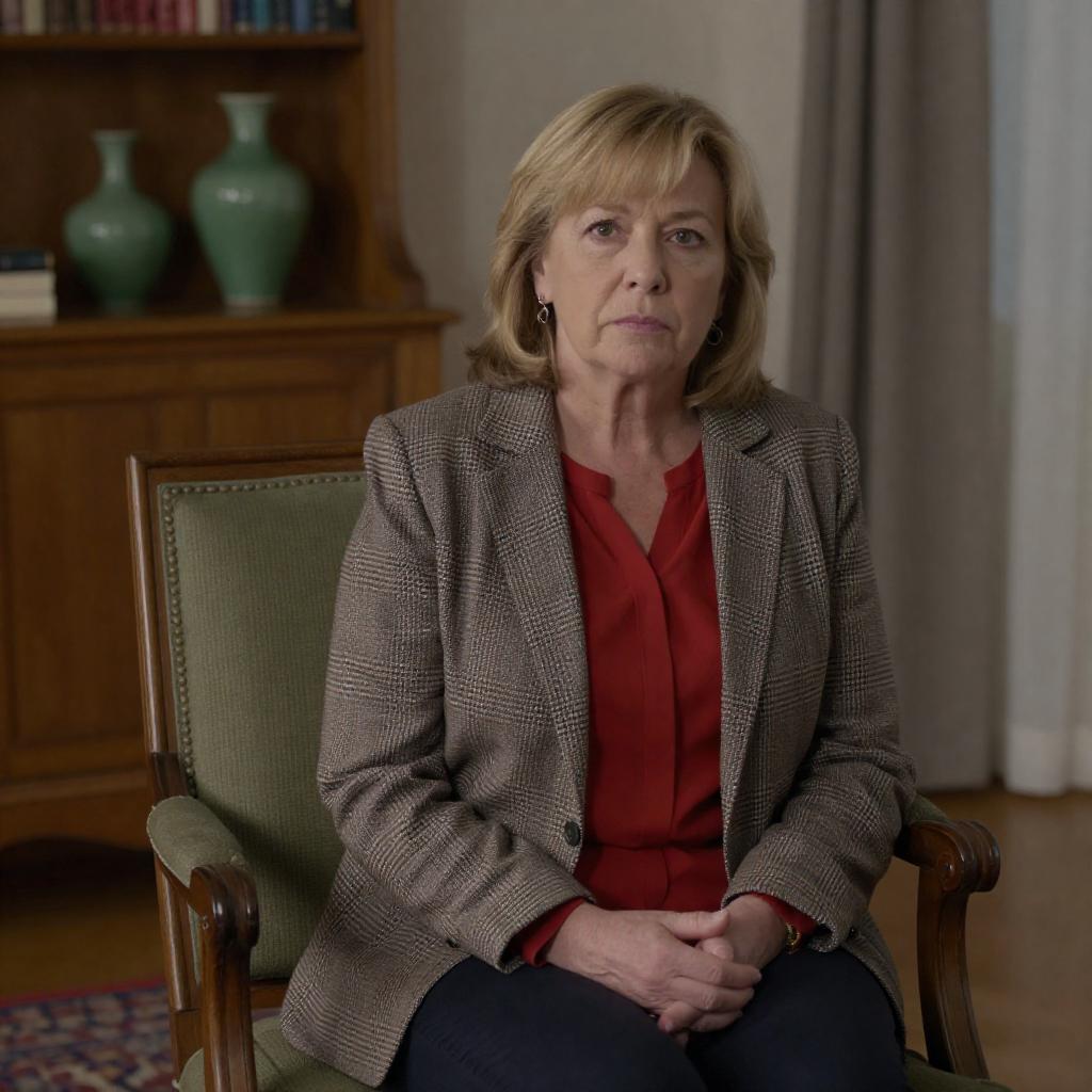 A middle-aged woman with short blonde hair, wearing a light yellow shirt, sits at a table with a white lace tablecloth. She smiles slightly. On the table are a teacup, a teaspoon, and a notebook. Behind her, a tall floor lamp with a red and white shade stands next to a brick pillar. Two red leather armchairs are in the background. To the right, a window with sunlight streaming in illuminates a potted plant and a stereo system. Two chairs with white and gray patterns are at the table.