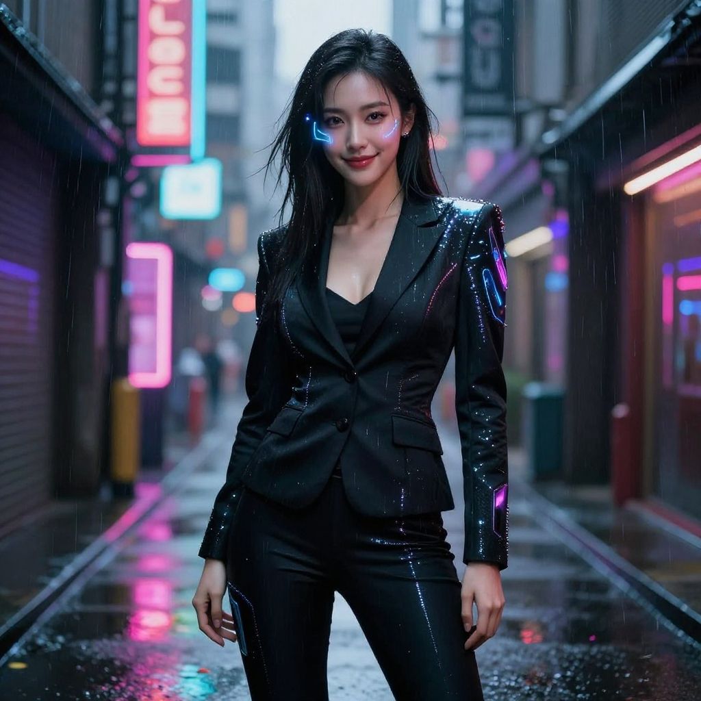 Photograph of an Asian woman with long, wet black hair standing in a neon-lit, rain-soaked alley. She wears a shiny black, sequined blazer with a deep V-neck over a black top, and matching black pants. Her expression is confident with a slight smile. The alley is narrow, with colorful neon signs in pink, blue, and white in the background, reflecting on the wet pavement. The scene has a cyberpunk aesthetic, with vivid colors and a moody, urban atmosphere. The woman's skin is fair, and her makeup is subtle. Raindrops are visible on her face and clothes.