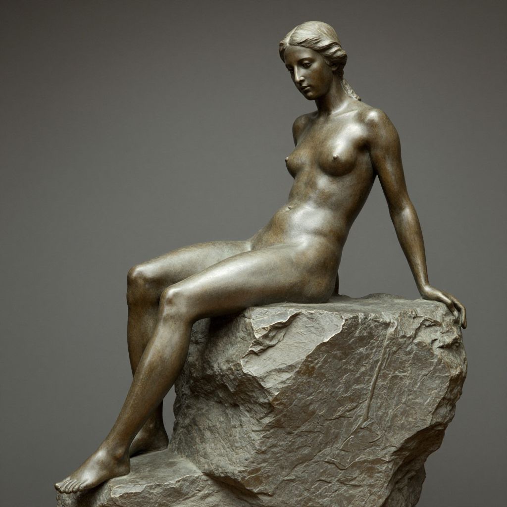 Naked woman sculpted in bronze sits gracefully atop a textured rock, her form captured in serene repose with one arm resting on the stone and her gaze directed forward, embodying classical elegance and timeless artistry.