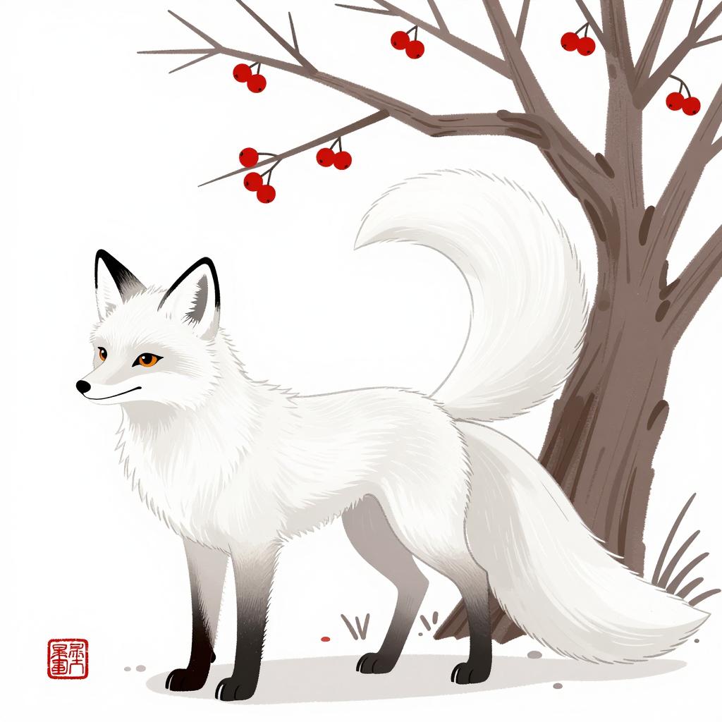Illustration of a white fox with multiple long, curved tails. Fox stands to the left, looking to the right. Background features a gnarled tree with red berries on the right. Fox's tail swirls around tree branch. Tree branches are ured and gray. Red seal in bottom left corner. Fox has sharp ears and pointed snout.