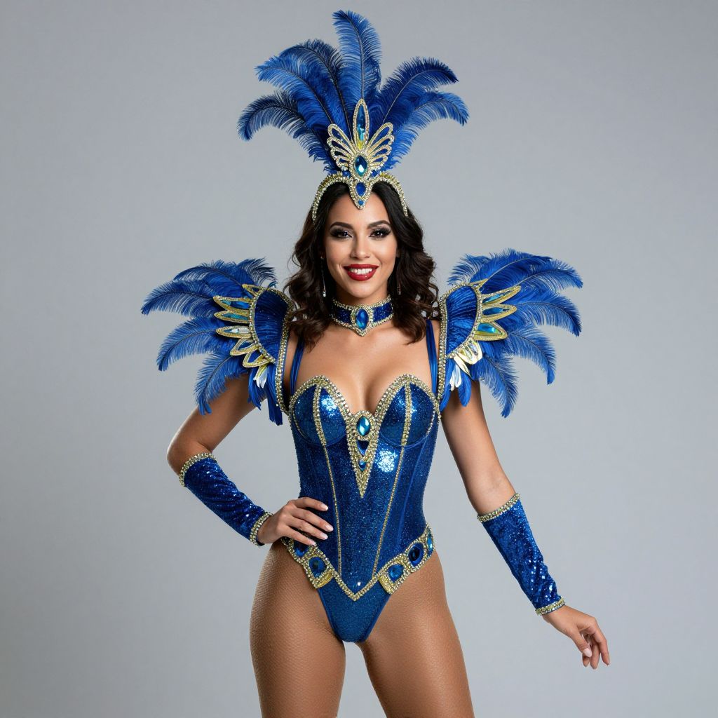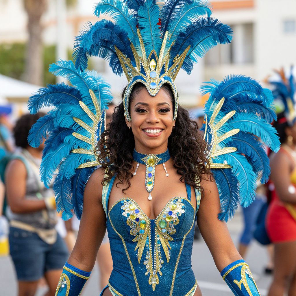 Photograph of a smiling Black woman in a vibrant blue Carnival costume with gold accents, large feathered headdress, and sequined bodice, walking