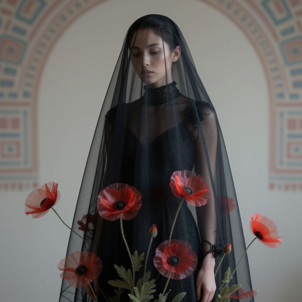 A hyper-realistic digital portrait of a woman with a serene, contemplative expression, her figure elegantly draped in a sheer, black veil that partially obscures her face and body, adding an aura of mystery, She stands against a pale, neutral background with vibrant Aztec patterns that highlights her light, almost translucent skin and slicked-back hair, amplifying the ethereal quality of her presence, Her attire is a dark, high-necked dress adorned with vivid red poppies, their petals rendered in a semi-transparent, ghostly manner that blends seamlessly with the flowing veil, The poppies' stems and leaves extend organically toward the viewer, as if bridging the divide between fashion and nature, Soft, diffused lighting envelops the scene, casting a delicate, hazy glow that enhances the dreamlike quality, The veil's delicate texture, the fine detailing of the dress, and the vibrant contrast of the poppies against the subdued palette create a harmonious fusion of surrealism and high fashion, resulting in an emotionally evocative, visually striking composition, flawless anatomy