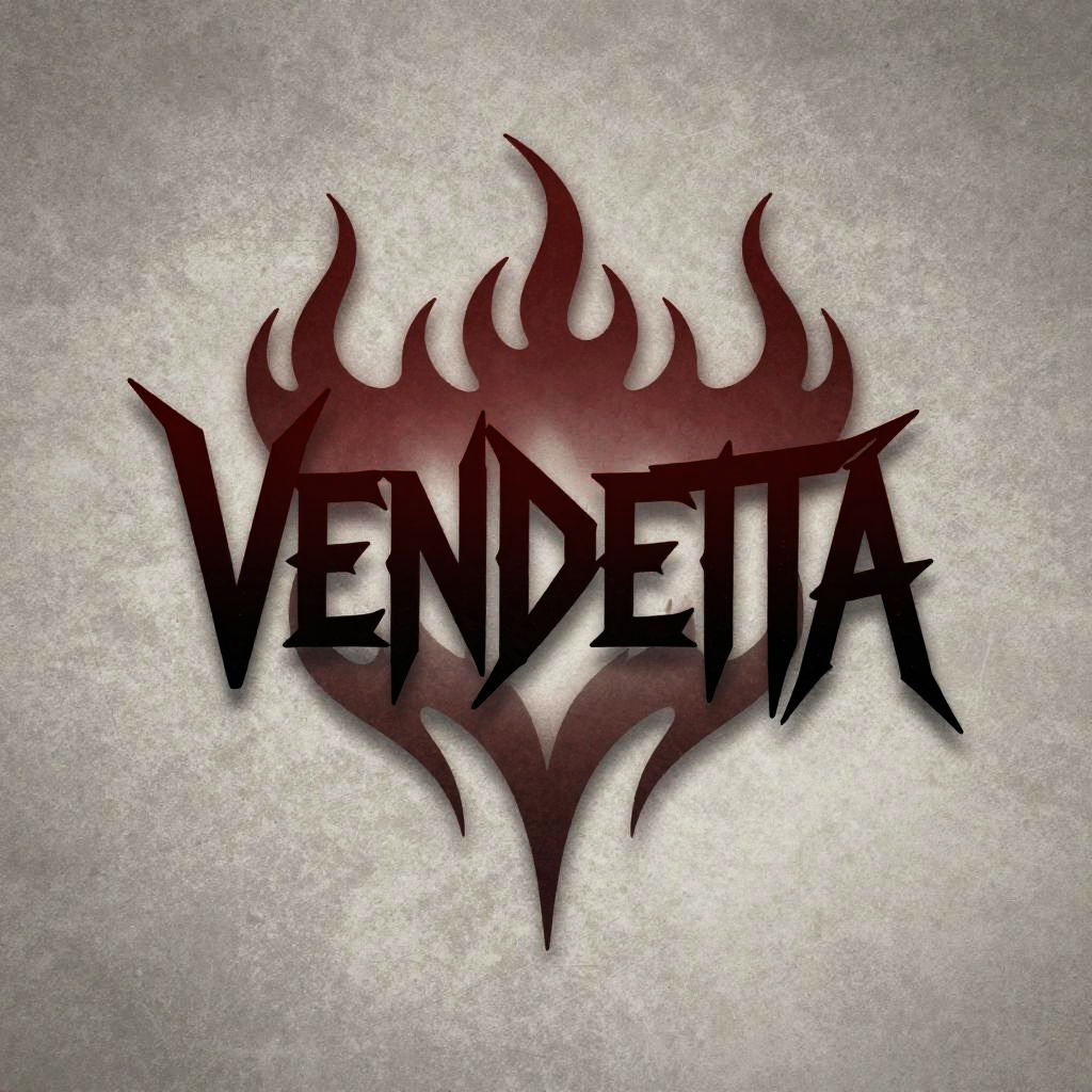 Vendetta logo design featuring sharp, angular typography with dark red and black color scheme, incorporating a subtle shadow effect and a mysterious, rebellious vibe, surrounded by abstract flame-like or smoke elements, on a gritty textured background.