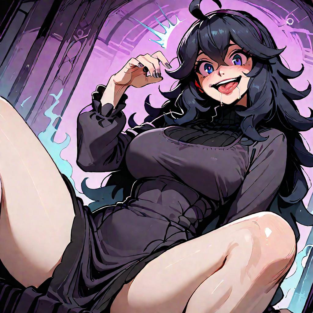 Score_9, score_8_up, score_8, medium breasts, (curvy), cute, eyelashes, solo, big breasts, absurdres, hex maniac (pokemon), @_@, ahoge, aura, black dress, dress, drooling, dutch angle, fingernails, flipped hair, hair between eyes, hairband, head tilt, long dress, long hair, long sleeves, looking at viewer, nail polish, open mouth, pokemon xy, purple hairband, sitting, smile, spread legs, turtleneck